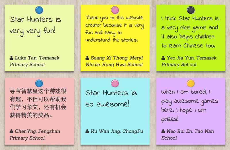 Star Hunters is Singaporean student’s favourite online Chinese reading game! More than 7000 students have joined us and we have received many comments and feedback from them throughout the time. Click the gallery below or here to see more of what they are saying.